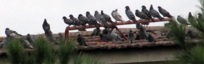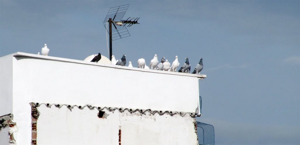 Hay que echarse a temblar. Pensemos que cada «bichito» defeca la nada despreciable cantidad de diez kilos de su ácido excremento al año. Calculen, calculen… Dos palomas por dos, cuatro; por cuatro, dieciséis… Cada pareja de palomas se convierten en doce individuos a los seis meses; en setenta y dos al año, casi dos mil al cabo de los dos años, … por diez kilos de cagadas, … ¿Cuánta mierda de paloma aguantarán nuestras calles y nuestros tejados?